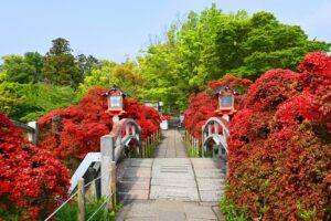 境内を真っ赤に染める春のキリシマツツジは圧巻です。 大山崎町にあるアサヒグループ大山崎山荘美術館などと組み合わせしやすい場所です。 |